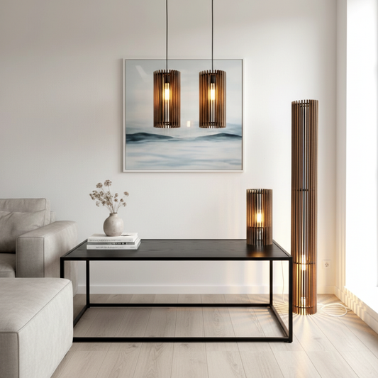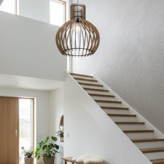 Denna moderna taklampa i trä kombinerar skandinavisk minimalism med naturlig värme. Lampans unika design med...