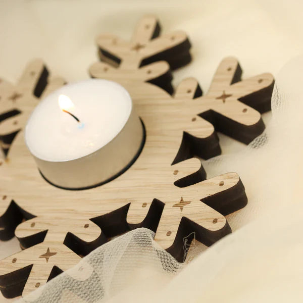 Skapa en mysig och naturlig stämning med denna vackra ljusstake i ek, formad som en elegant snöflinga. Ljusstaken är tillverkad av ek och mäter 13x11 cm, vilket gör den perfekt som en dekorativ detalj på julbordet, i fönsterkarmen eller som en del av en varm vinterdekoration.