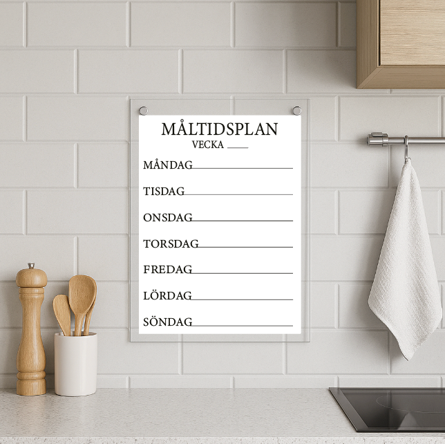 Denna snygga matplan gör det enkelt att ha en överblick över veckans rätter! Den kan användas om och om igen, och lätt torkas av med en våt trasa, eftersom den är gjord av klar akryl. Matplanen är unikt utformad för att göra vardagen enklare för den upptagna familjen. Dess enkla design och lätta överblick gör att den passar in i alla hem.