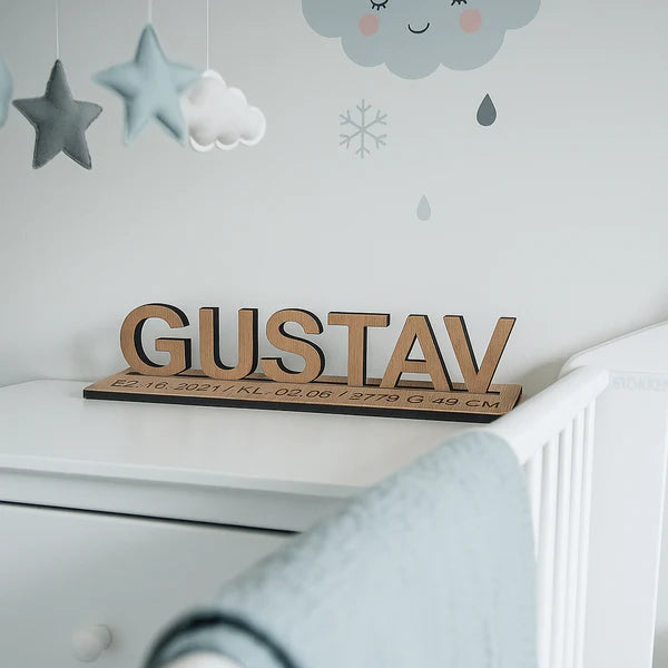 Skapa en stilren namnskylt för barnrummet med barnets personliga uppgifter!