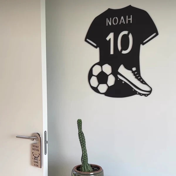 En stilfull namnskylt utformad som en spelartröja, tillverkad i vår mattsvarta akryl och skräddarsydd med barnets namn.