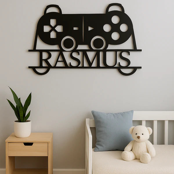 Ge gaming-setupet eller rummet en unik och personlig touch med denna coola namnskylt formad som en spelkontroll. Skylten kan anpassas med ditt önskade namn och finns i antingen exklusiv ek eller stilren svart akryl, vilket ger en modern och elegant look.