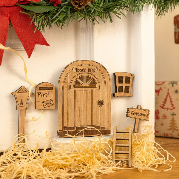 En söt och personlig tomtedörr med tillhörande brevlåda, lyktstolpe, fönster, välkomstskylt och trappa!