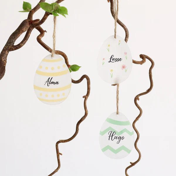 Vi har gjort dessa påskägg med personligt namn eller text, som kan användas år efter år – och de blir en vacker dekoration i alla hem!