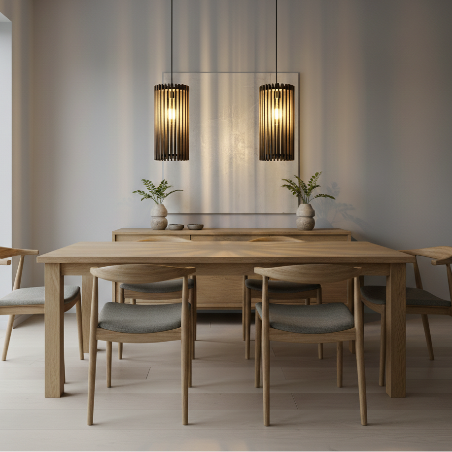 Upptäck vår vackra pendellampa i massiv ek – ett stilrent val för dig som vill tillföra värme, mys och nordisk charm till din inredning. Den unika lampskärmen består av vertikala ekribbor som vackert omger ljuskällan och skapar ett stämningsfullt spel av ljus och skuggor i rummet.