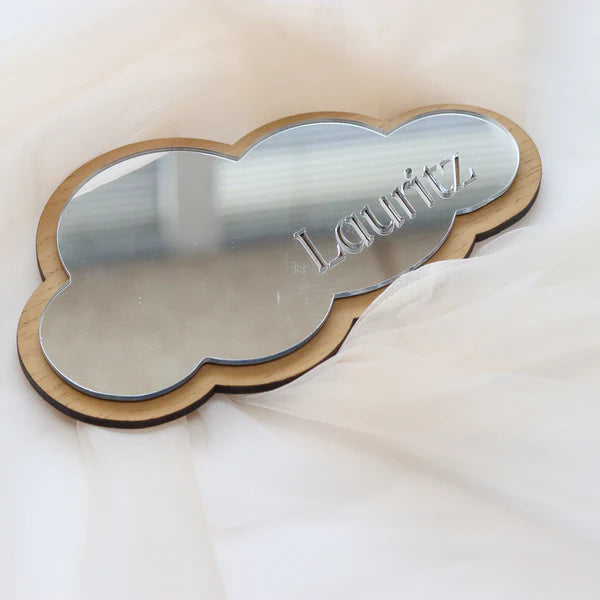 En elegant molnspegel snidad som ett moln. Den kommer i finaste ek med en akrylspegel framtill och passar både pojk- och flickrum, och kan personifieras i form av barnets namn.